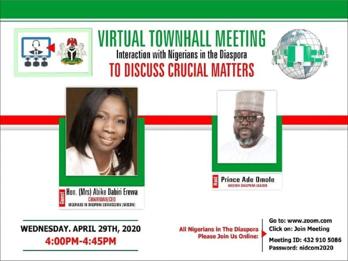 Chairman/CEO Nigerians in Diaspora Commission, Hon (Mrs) Abike Dabiri-Erewa will hold virtual conference with diasporas on Wednesday April 28, 2020.